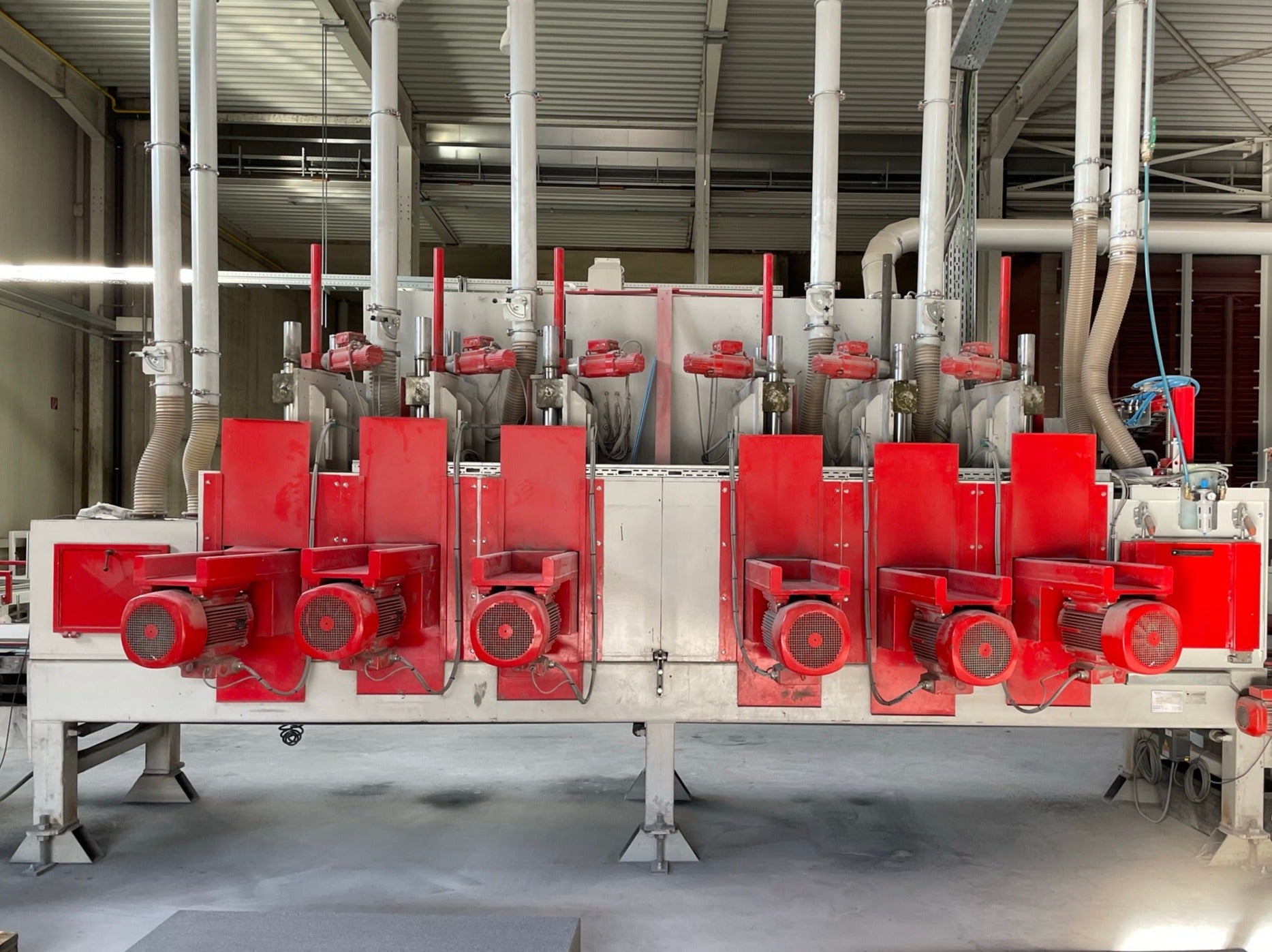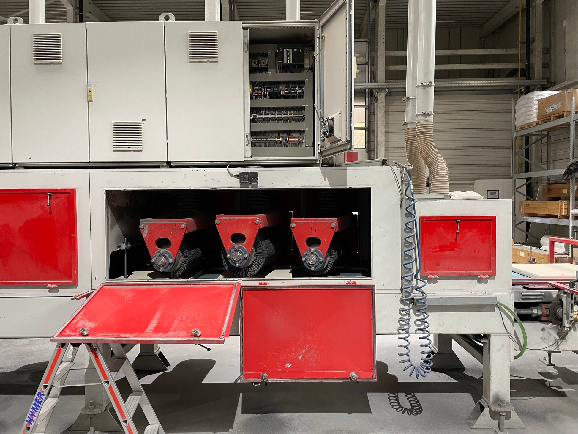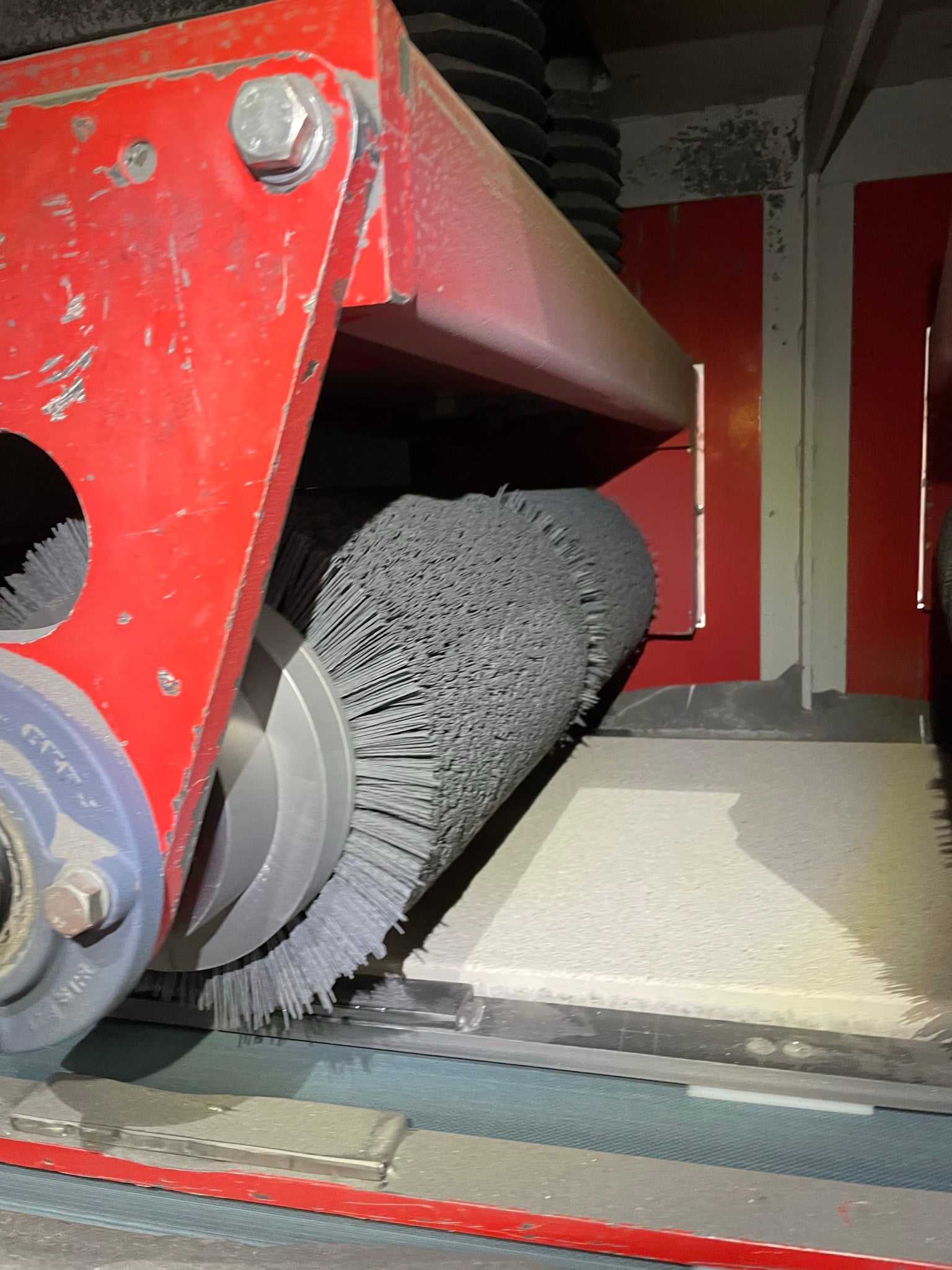 The brushing rollers are positioned at an angle, to treat the stone from multiple angles (non-oscillating).